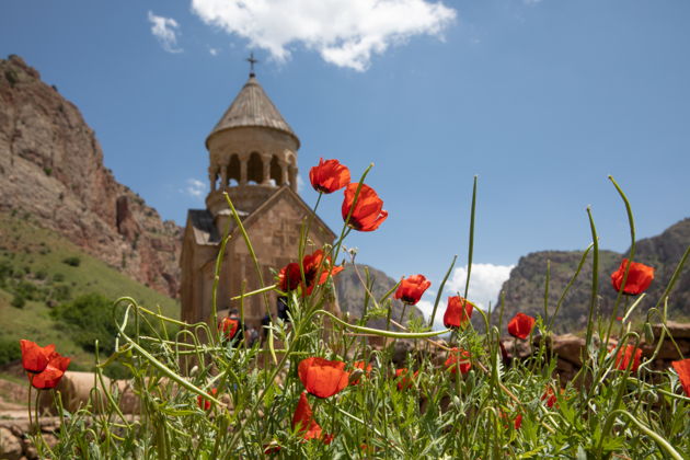 Величественный монастырь Нораванк, спрятанный среди красных скал живописного каньона. Здесь находится единственное изображение Бога Отца в армянской архитектуре, а также уникальные захоронения рода Орбелянов прямо в церкви — вопреки строгим запретам того времени.