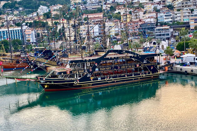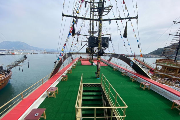 Наша яхта отплывает из порта Алании, где вы сразу сможете увидеть древнюю крепость Красная Башня и старые корабельные верфи. Далее проплывем мимо Пиратской пещеры, именно с ней связано самое большое количество преданий и легенд.