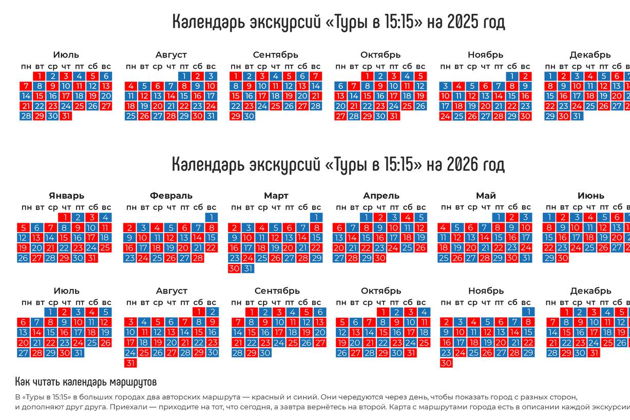 В зависимости от дня недели вы прогуляетесь по одному из двух маршрутов — Красному или Синему.