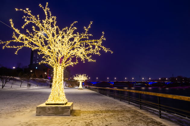 Начнём волшебное путешествие от Театральной площади, где главной героиней становится нарядная ёлка, а свето-музыкальные фонтаны создают особое праздничное настроение. Далее пройдём по набережной Енисея, чтобы полюбоваться, как могучий Енисей и величественный Коммунальный мост хорошеют в зимнем убранстве.