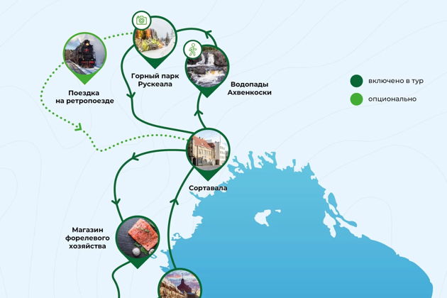 Прекрасная возможность за один день окунуться в атмосферу зимней сказки и увидеть настоящее сокровище Карелии – горный парк «Рускеала»! Волшебство цветных огней на мраморных скалах в окружении неповторимой северной природы подарит вам незабываемые впечатления! Маршрут продуман таким образом, чтобы дорога не была утомительной, а вы познакомились с самыми знаковыми местами региона.