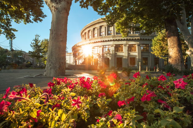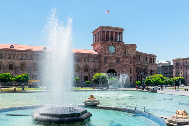 Конечный пункт нашей пешей прогулки — Площадь Республики. Это центральная площадь армянской столицы, построенная по проекту А. Таманяна в середине XX века.