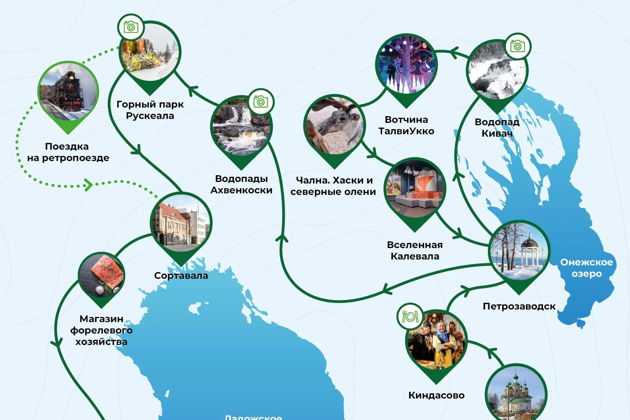 Мы предлагаем совершить ваш личный гран-тур по Карелии! Вас ждет дивная красота природы Русского Севера и продуманный маршрут с веселыми интерактивами, познавательными экскурсиями, посещением питомника хаски, фермы северных оленей и жемчужины Карелии – горного парка «Рускеала»!